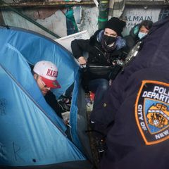 | Seven people were taken away in cuffs as city sanitation workers broke up a homeless encampment in the... |