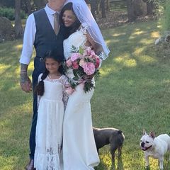 | The bride wore a white floor-length gown with a long train and sleeves made of lace, while the groom... |