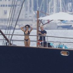 The couple arrived at the massive yacht by helicopter. They got engaged late last month before jetting...
