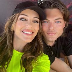 Bikini-clad Elizabeth Hurley cuddles up to look-alike son Damian while celebrating...